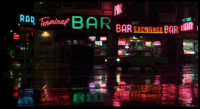e) przypadkowa kolorystyka w zestawieniu neonów i świateł na danym fragmencie ulicy – zanikanie jednolitości charakteru plastycznego w obrębie sceny, skutkujące przełamywaniem jednolitości jej nastroju.