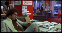 c) płytka głębia ostrości[20], szczególnie wyraźnie dostrzegana w ujęciach z przeostrzeniami z planu pierwszego na drugi (poniższy przykład trzech klatek pochodzi z jednego ujęcia). „Wybieranie ostrością” jest efektem wizualnym obcym normalnemu doświadczeniu wzrokowemu, jednak używane wielokrotnie w kinie uległo skodyfikowaniu jako chwyt typu narracyjnego, zmuszający widza do kierowania uwagi zgodnie z przemieszczającą się ostrością. Akceptacja tego chwytu następuje jednak pod warunkiem umotywowania owych „wybierań ostrością” śledzeniem akcji, a samo kreowanie nastroju przy jego pomocy jest odbierane jako „zbędne (naddane!) uporządkowanie” – po prostu koniec ujęcia po przeostrzeniu jest tak samo nieistotny jak jego początek, akceptujemy tylko rytm, w jakim się ono odbywa (ważna jest także muzyka w tle).