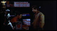 Travis i „Magik” rozmawiają przed wejściem do kawiarni. Oś akcji (rozmowy) jest skośnie ustawiona do budynku i krawędzi chodnika, w tle obu aktorów zupełnie odmienna przestrzeń, ale „Magik” oświetlony jest na czerwono, a jego interlokutor nie, ani na twarzy, ani w tle.